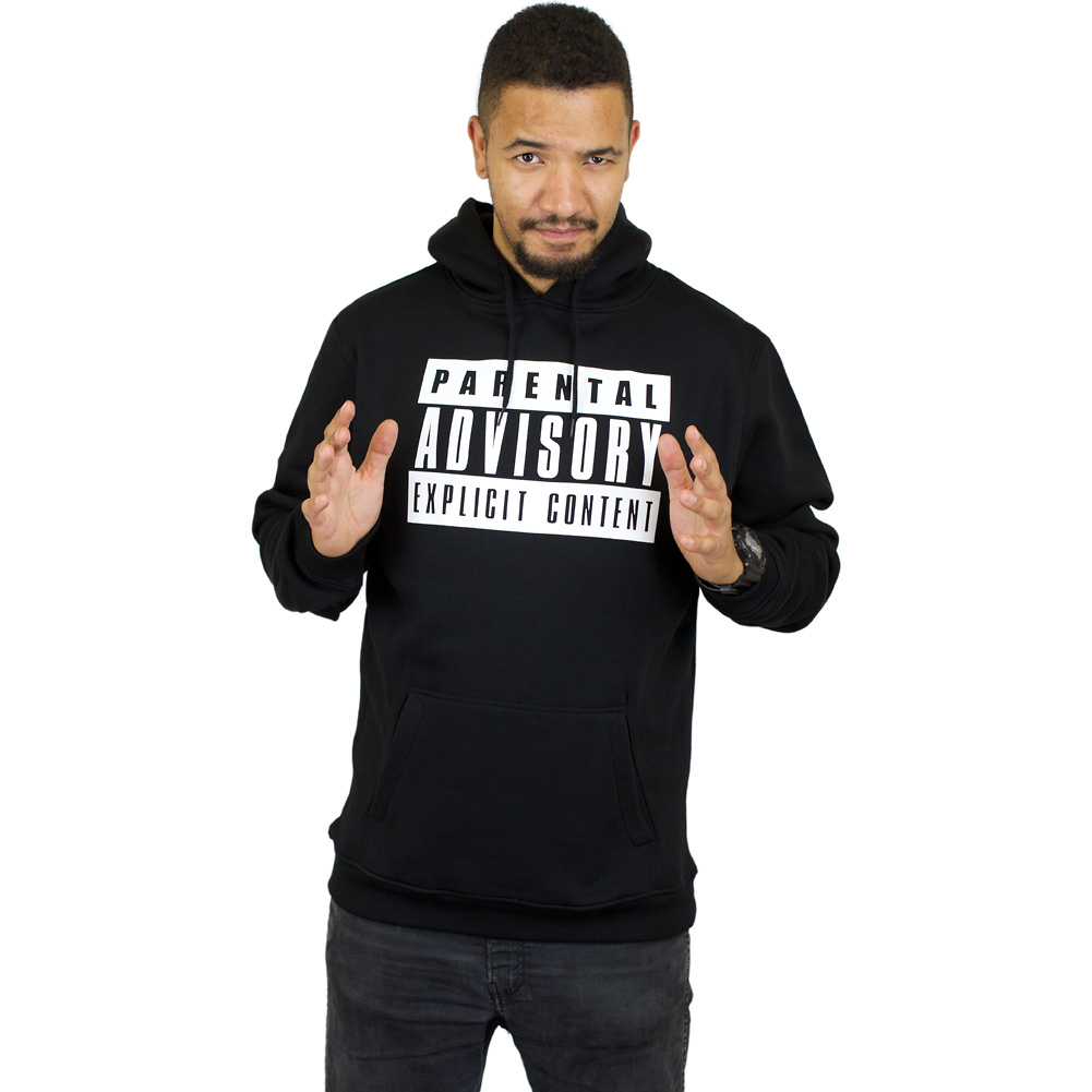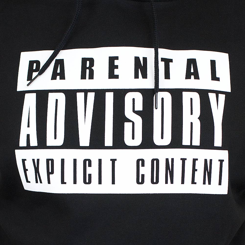 Must-Have Snapback für alle Hip Hop Heads: Schwarzer „Parental Advisory“ Hoody mit dem bekannten Warnhinweis auf der Vorderseite.